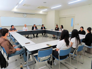 10月7日(火)、協定校からの特別聴講学生(経済学部)5名と青木経済学部長、国際交流委員の水野教員・緒方教員、留学生を担当する渡邉教員、留学生達の生活をサポートする学生たちの顔合わせを行いました。 特別聴講学生は、東西大学(韓国・1名)、ラインマイン応用科学大学(ドイツ・1名)、真理大学(台湾・3名)からの留学生で、これから6か月または1年の間、香川大学で学びます。