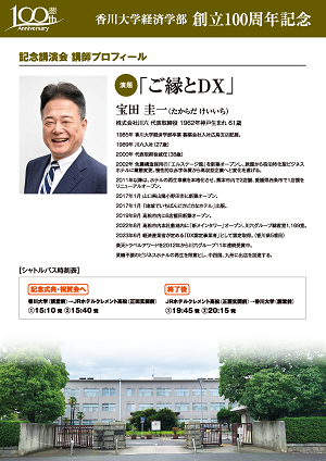記念講演会 | 13:30~15:00 | 講 師:宝田 圭一 氏 (株式会社川六 代表取締役 経済33回卒) 演 題:「ご縁とDX」 場 所:香川大学総合教育棟 (記念講演会は学生限定とさせていただきます) |