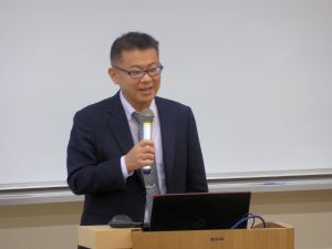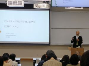 沖教務委員長より学部のカリキュラム等について、青木就職委員長より経済学部の就職状況・就職活動の現況等について、
