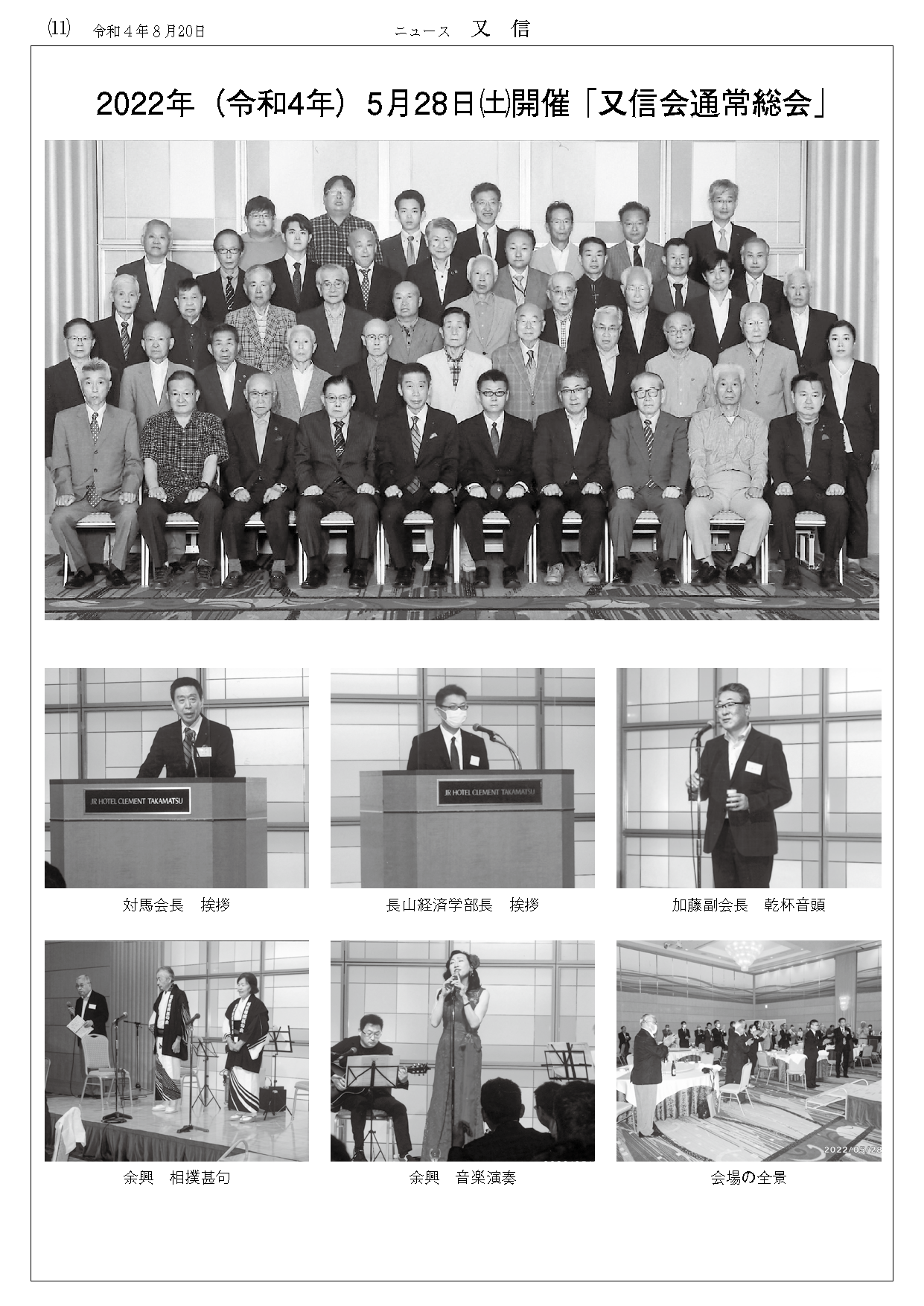 令和4年5月28日(土)JRホテルクレメント高松において、経済学部・法学部・大学院研究科・商業短期大学部の同窓会組織である又信会の総会が行われました。 新型コロナウィルス感染拡大の影響により令和2年度・3年度は総会のみの開催でしたが、今年は3年ぶりに懇親会も開催されました。