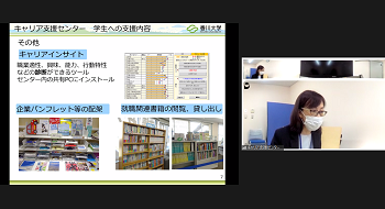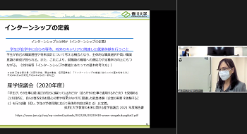 キャリア支援センターより原瑞穂副センター長と圖子キャリア支援課長をお招きし、松岡久美教員の司会進行によりオンライン(Zoom)で行われました。